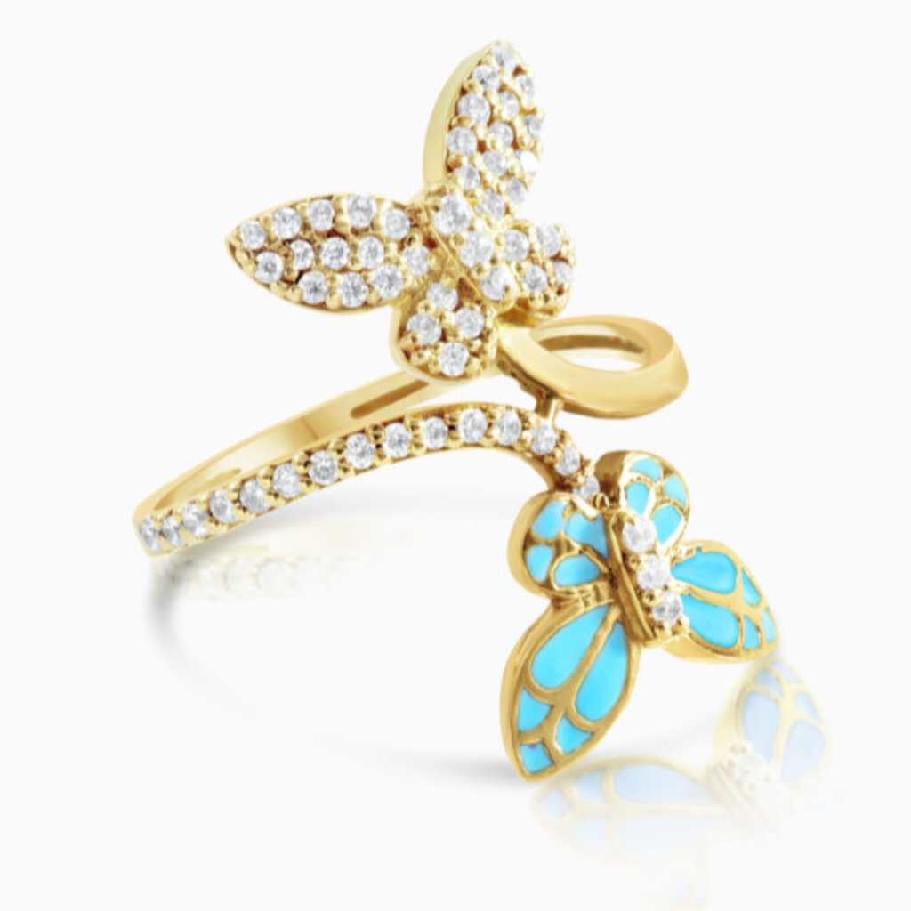 Butterfly Dance Gold Ring studded with Zirconia and enamel where Arabian gold is used with a contemporary concept to make an accent jewelry piece perfect for occasion wear or gifts. Weight (in grams) approx. 3.64gms Metal Purity 21k Stones Zirconia with Feyrouzi Enamel