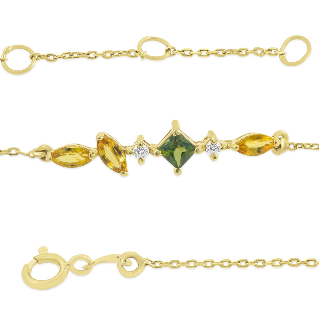 Dainty Gold Bracelet from TETRIS Collection for daily/ office wear jewelry. It’s versatile design characteristics allows it to be worn on it’s own and can also be easily stacked with existing jewelry, making it a perfect buy to enhance your personal style as well as for gifts. Weight (in grams) approx 1.06 gms Metal Purity 18k Stones Diamonds with yellow marquise sapphires and princess cut green sapphire.