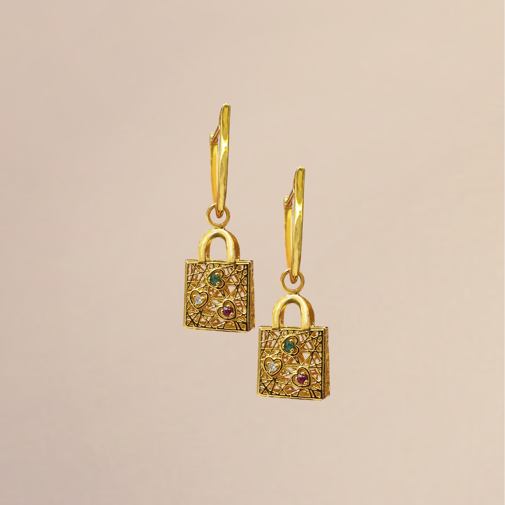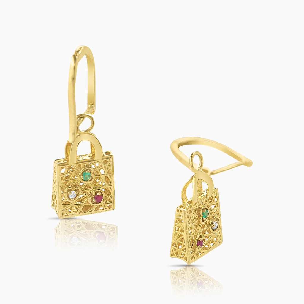 Dainty Gold Earrings from our Bags collection specifically designed to create a balance between minimal yet a statement piece of Jewelry made in Bahrain. It’s unique concept making it a perfect buy to enhance your personal style and gifts. Weight (in grams) approx. 4.40 gms Metal Purity 21k Stones Diamonds, Emerald and Bahraini Pearls.
