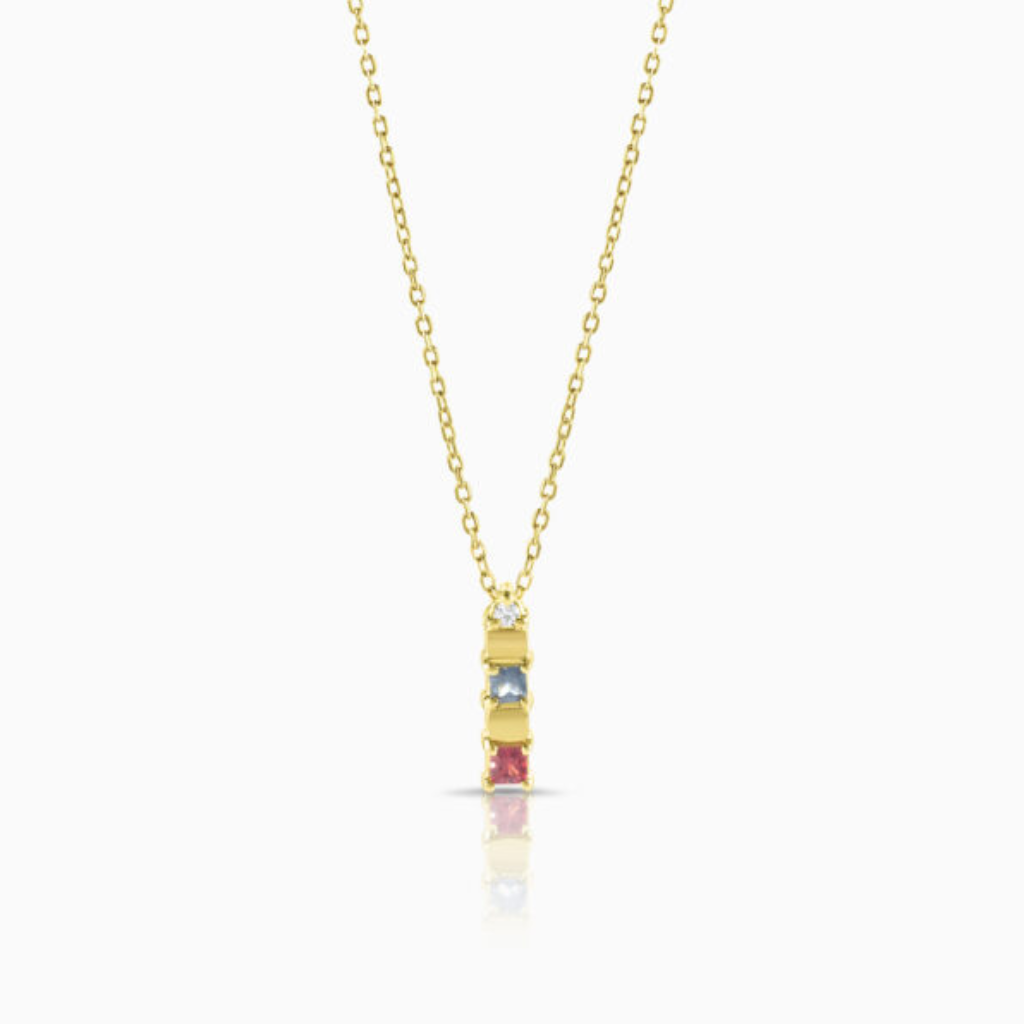 Dainty Gold Necklace from Tetris Collection for daily/ office wear jewelry. It’s versatile design characteristics allows the necklace to be worn on its own and can easily be stacked with your existing jewelry, making it a perfect buy to enhance your personal style as well as for gifts. Weight (in grams) approx 2.00gms Metal Purity 18k Stones Diamonds with princess cut red and blue sapphires.