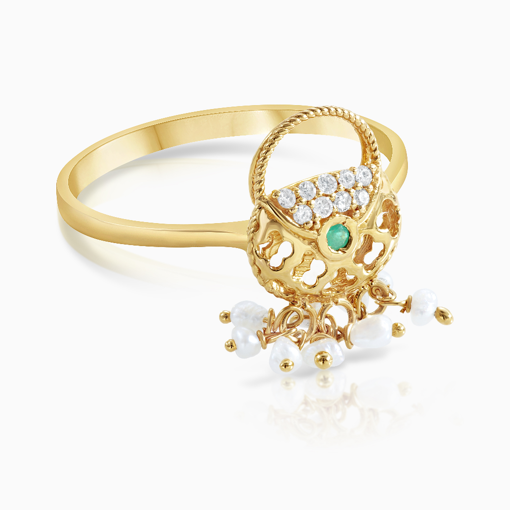 Jaipur Ring from our Bags collection specifically designed to create a balance between minimal yet a statement piece of Jewelry. Experience gold jewelry made in Bahrain with a unique concept, making it a perfect buy to enhance your personal style. Weight (in grams) approx. 2.30gms Metal Purity 21k Stones Diamonds, Emerald and Pearls.