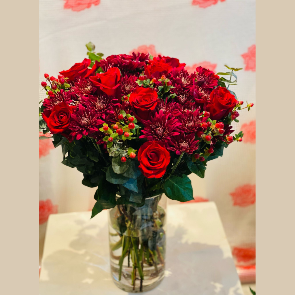 A breathtaking combination of deep red roses, rich crimson chrysanthemums, and delicate hypericum berries, beautifully arranged in a glass vase. This elegant bouquet symbolizes love, passion, and warmthβmaking it the perfect gift for Valentine's Day, anniversaries, or special occasions. Let your heartfelt emotions bloom with this stunning floral arrangement. π FREE delivery in Bahrain π§π π Size: Large π Perfect for: Valentine's Day, Romantic Gestures, Elegant Home Decor.