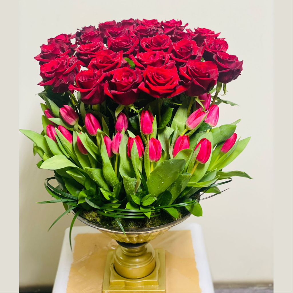 A breathtaking floral masterpiece combining lush red roses and vibrant pink tulips, elegantly arranged in a golden vase. This luxurious bouquet is a symbol of passion, elegance, and graceβmaking it the perfect statement piece for romantic occasions, special celebrations, and Valentine's Day. Let your love bloom with this stunning arrangement! π FREE delivery in Bahrain π§π π Size: Extra Large π Perfect for: Valentine's Day, Anniversaries, Luxury Gifting.
