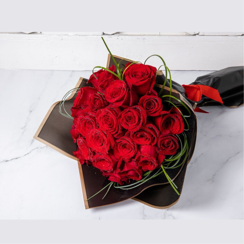 A bold and sophisticated bouquet of premium red roses, elegantly wrapped in black and gold for a touch of mystery and charm. This luxurious floral arrangement is the perfect way to express deep love, passion, and elegance. Whether for Valentine's Day, an anniversary, or a grand romantic gesture, this bouquet speaks the language of love effortlessly. 🚚 FREE delivery in Bahrain 🇧🇭 📏 Size: Large 🎁 Perfect for: Valentine's Day, Anniversaries, Elegant Gifting.
