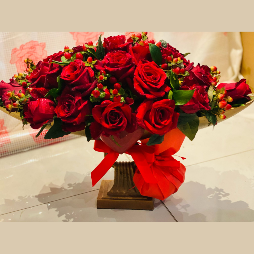 A majestic floral arrangement featuring rich red roses and delicate hypericum berries, elegantly displayed in a golden vase with a bold red ribbon. This luxurious bouquet is the perfect statement of love, passion, and sophistication. Ideal for romantic celebrations, anniversaries, and Valentineβs Day. π FREE delivery in Bahrain π§π π Size: Large π Perfect for: Valentine's Day, Anniversaries, Romantic Gestures